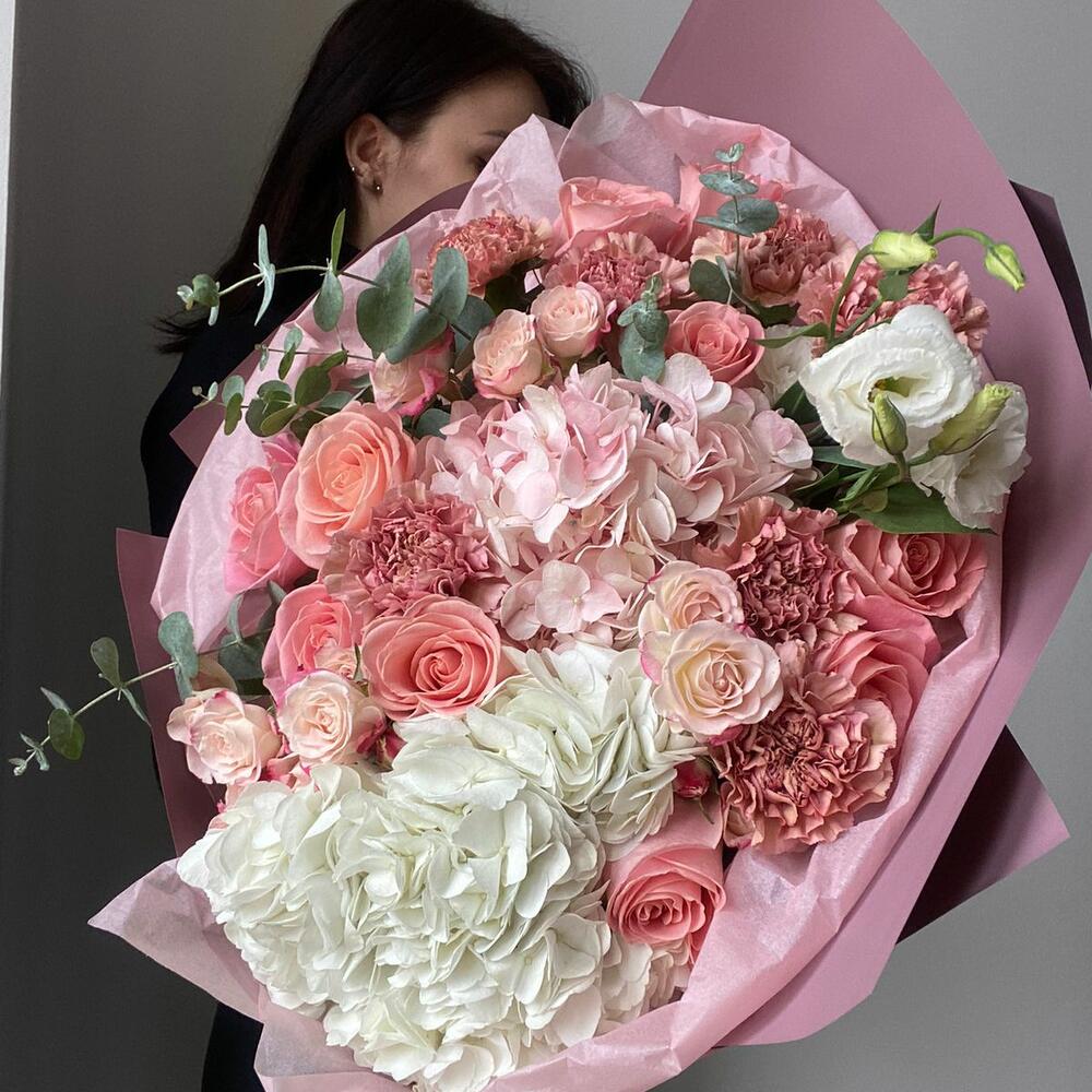 Альстромерии, Гвоздики, Кустовые розы, Лизиантусы, Розы, Хризантемы
