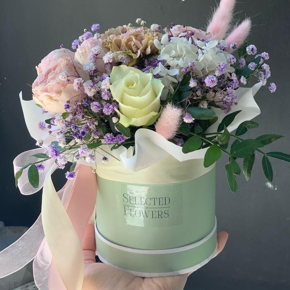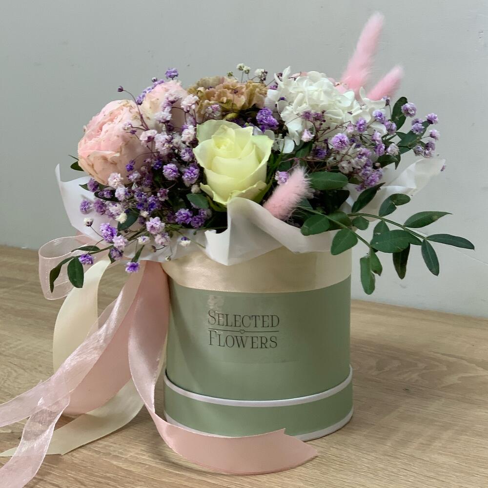 “Атлас☁️” – цветочная композиция с зефиром в деревянном ящике