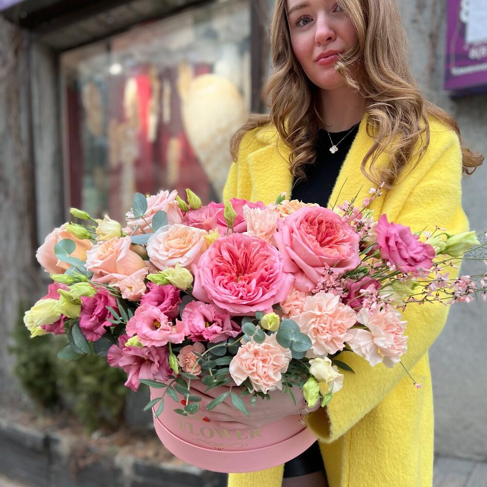 Цветочная коробка с пионовидными розами, лизиантусами, сортовыми диантусами, ароматными веточками джинстер, душистый эвкалипт и разными цветочными изысками!