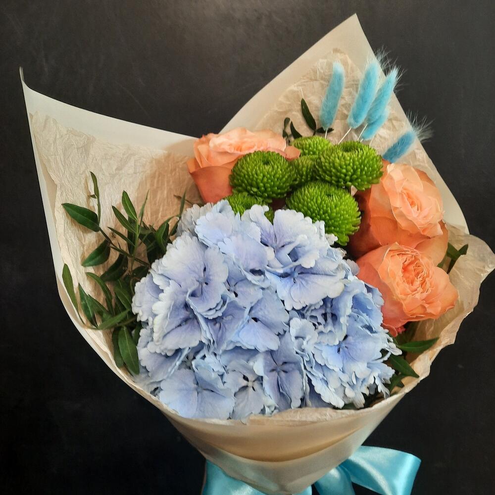 Гортензия – 1 шт.Кустовая хризантема – 1 шт.Роза пионовидная – 3 шт.Фисташка – 1 шт.Лагурус – 5 шт.Упаковка дизайнерская – 1 шт.