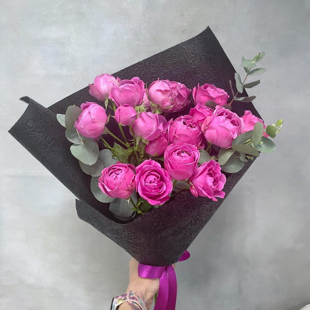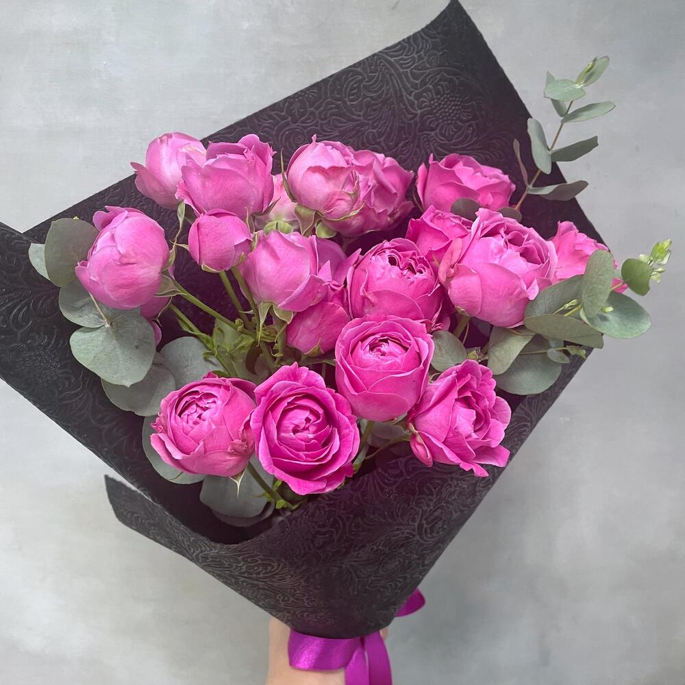 Роза кустовая пионовидная – 5 шт.Эвкалипт ценарея – 3 шт.Упаковка дизайнерская – 1 шт.