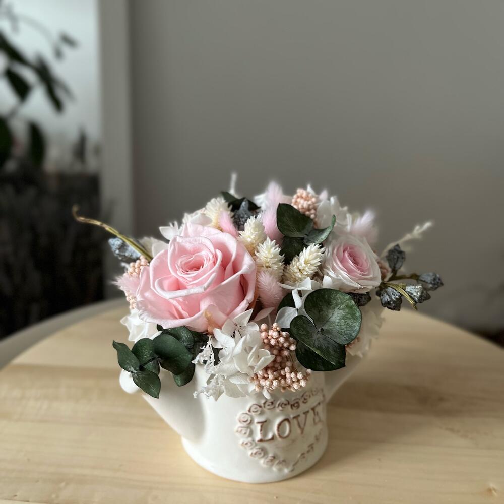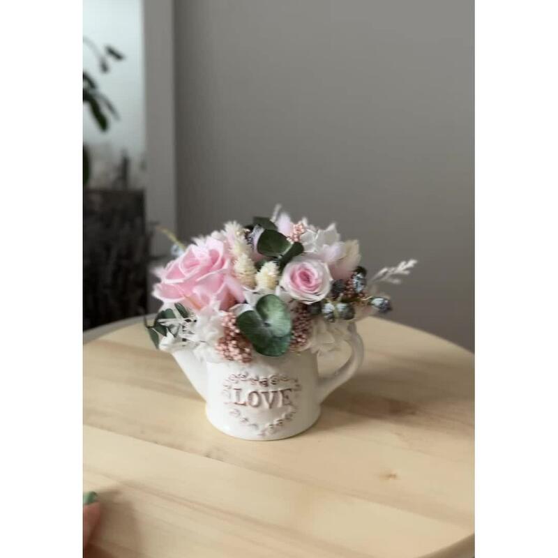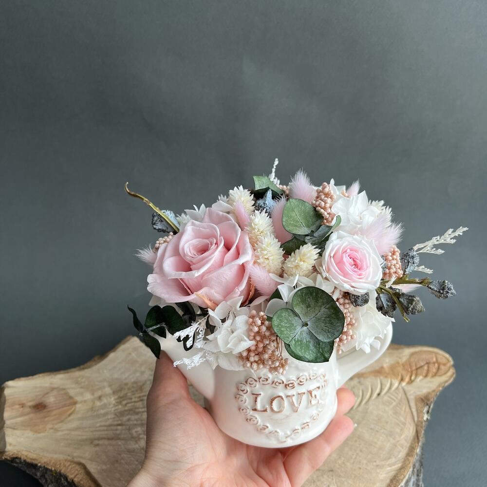 Композиция из сухоцветов и стабилизированных цветов в керамической лейке