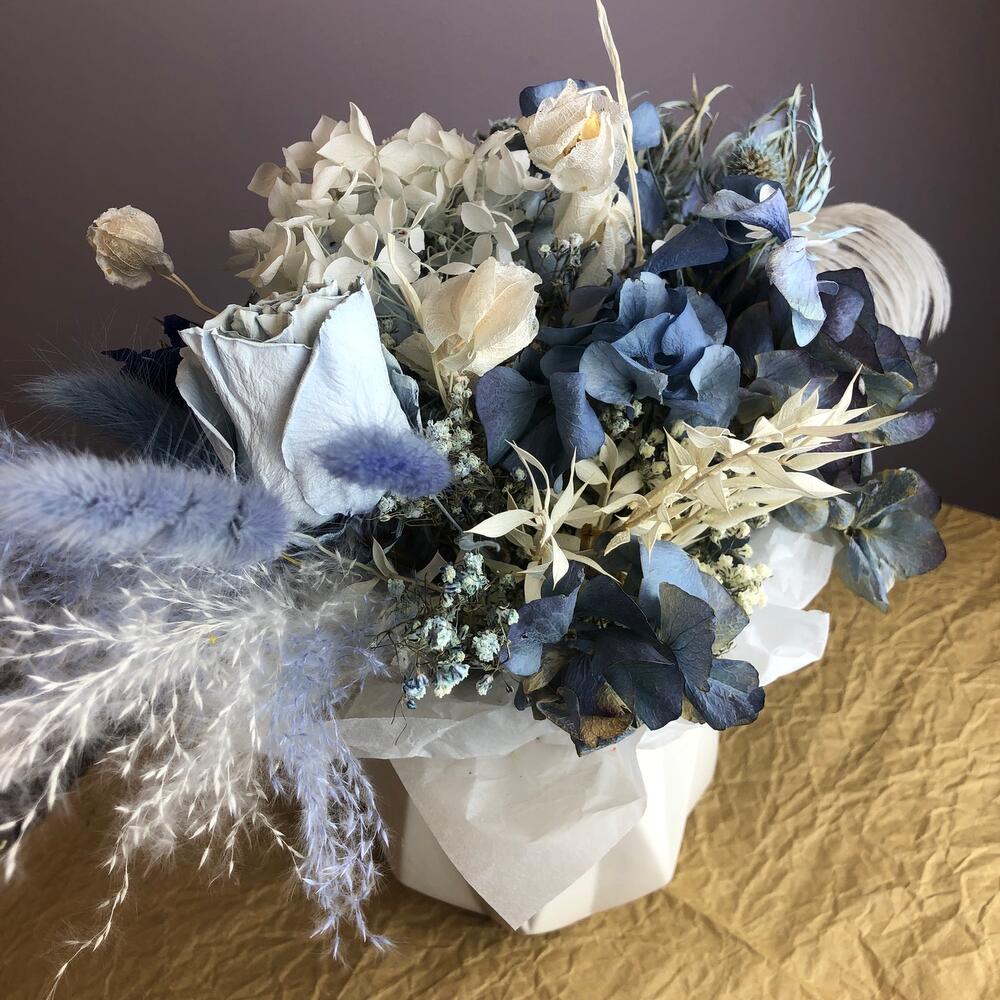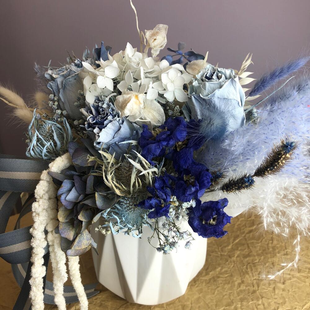 Кашпо керамическое – 1 шт.Упаковка дизайнерская – 1 шт.Оазис флористический – 1 шт.Роза стабилизированная – 3 шт.Перо – 1 шт.гипсофила сухоцвет – 2 шт.эрингиум сухоцвет – 1 шт.пампасная трава – 1 шт.гортензия сухоцвет – 2 шт.амарант стабилизированный – 1 шт.дельфиниум сухоцвет – 1 шт.Физалис – 1 шт.Лагурус (сухоцвет) – 8 шт.