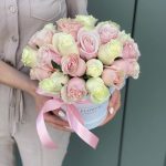 Роза розовая – 15 шт. Роза белая – 10 шт. Коробка – 1 шт. Оазис – 1 шт.