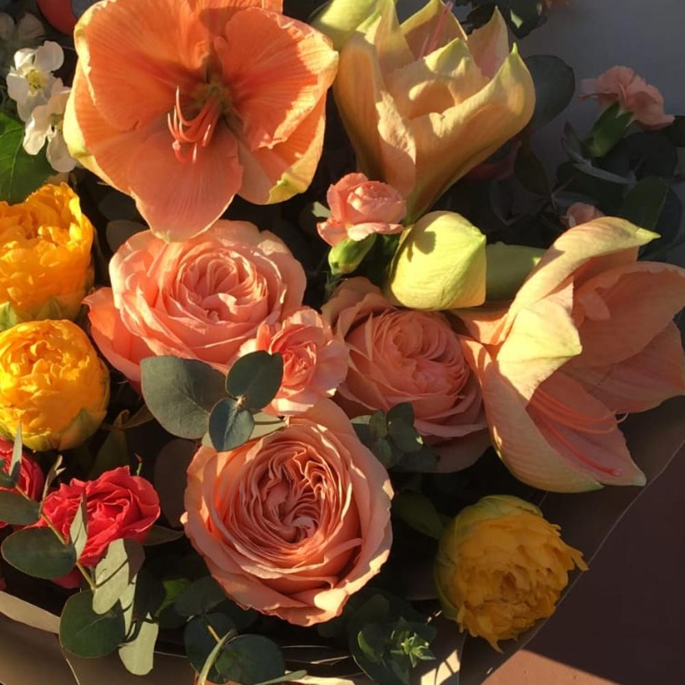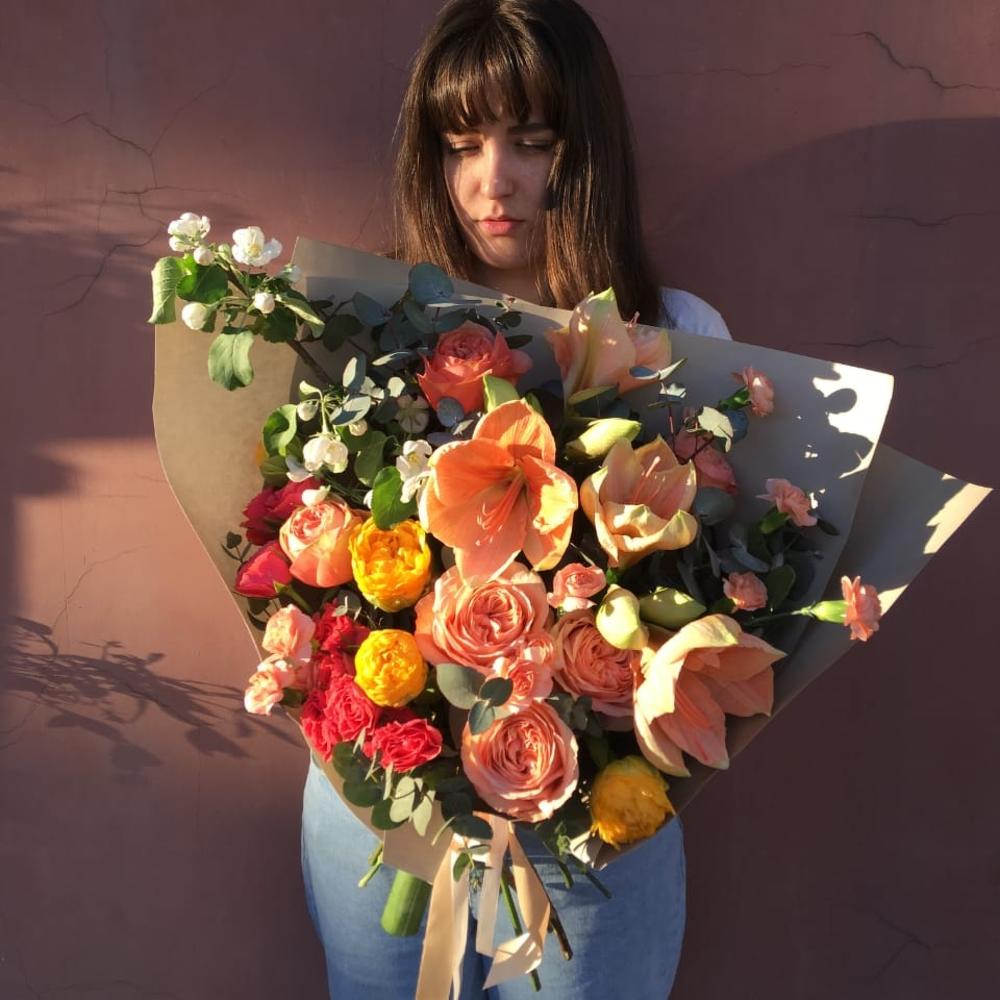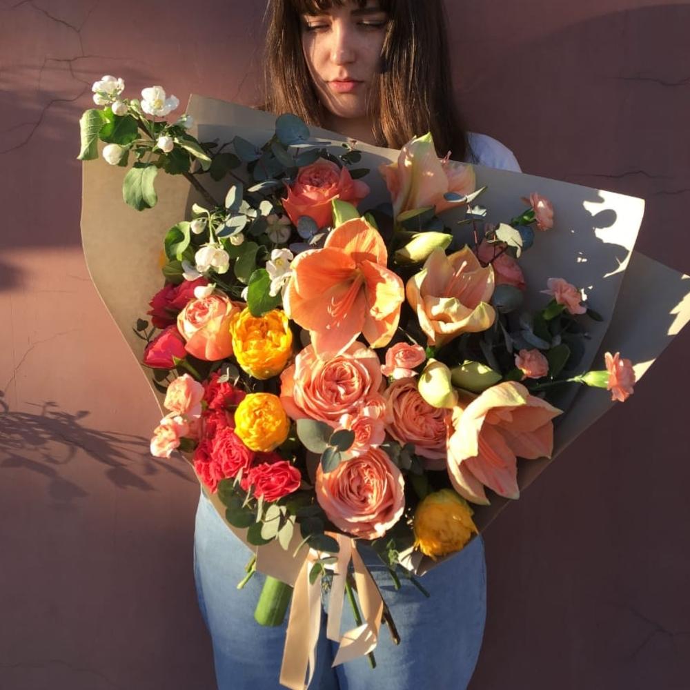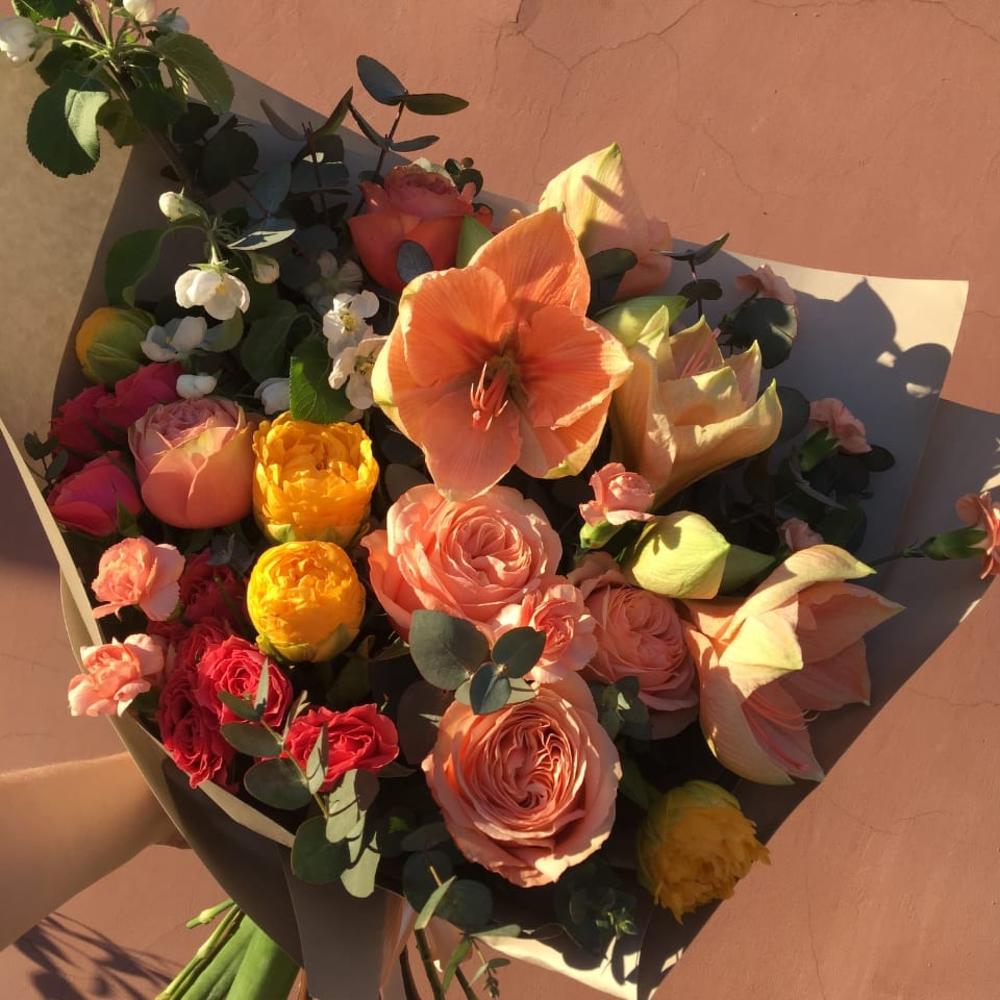 Амариллис – 2 шт.Роза кустовая – 2 шт.Роза пионовидная – 5 шт.Эвкалипт – 5 шт.Тюльпан сортовой – 3 шт.Упаковка дизайнерская – 2 шт.Лента атласная – 2 шт.
