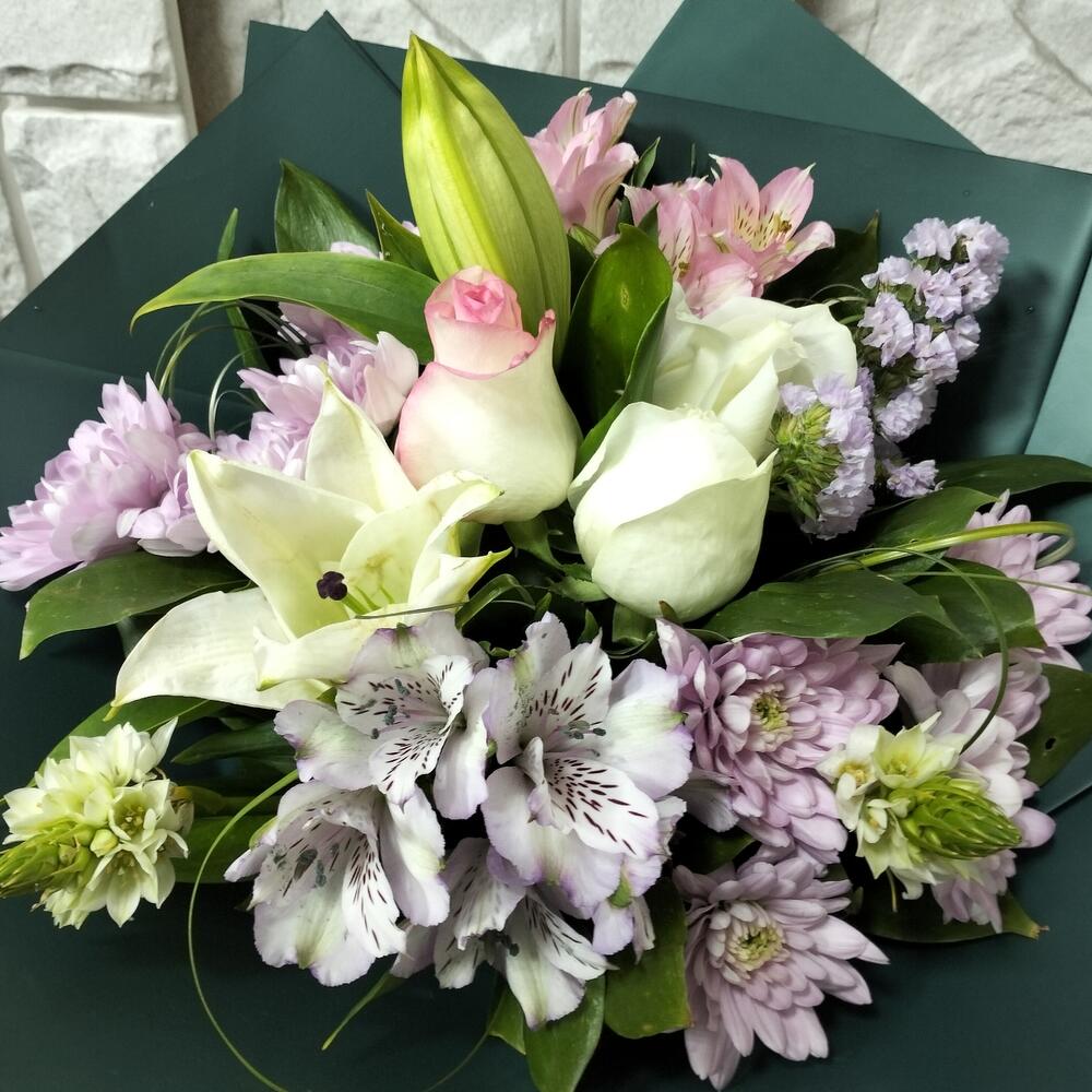 Хризантема кустовая – 2 шт.Роза эквадор 50 см – 3 шт.Альстромерия Микс Европа – 2 шт.Статица сиреневая – 1 шт.Лилия белая – 1 шт.Орнитогалум белый – 2 шт.Лента атласная – 1 шт.