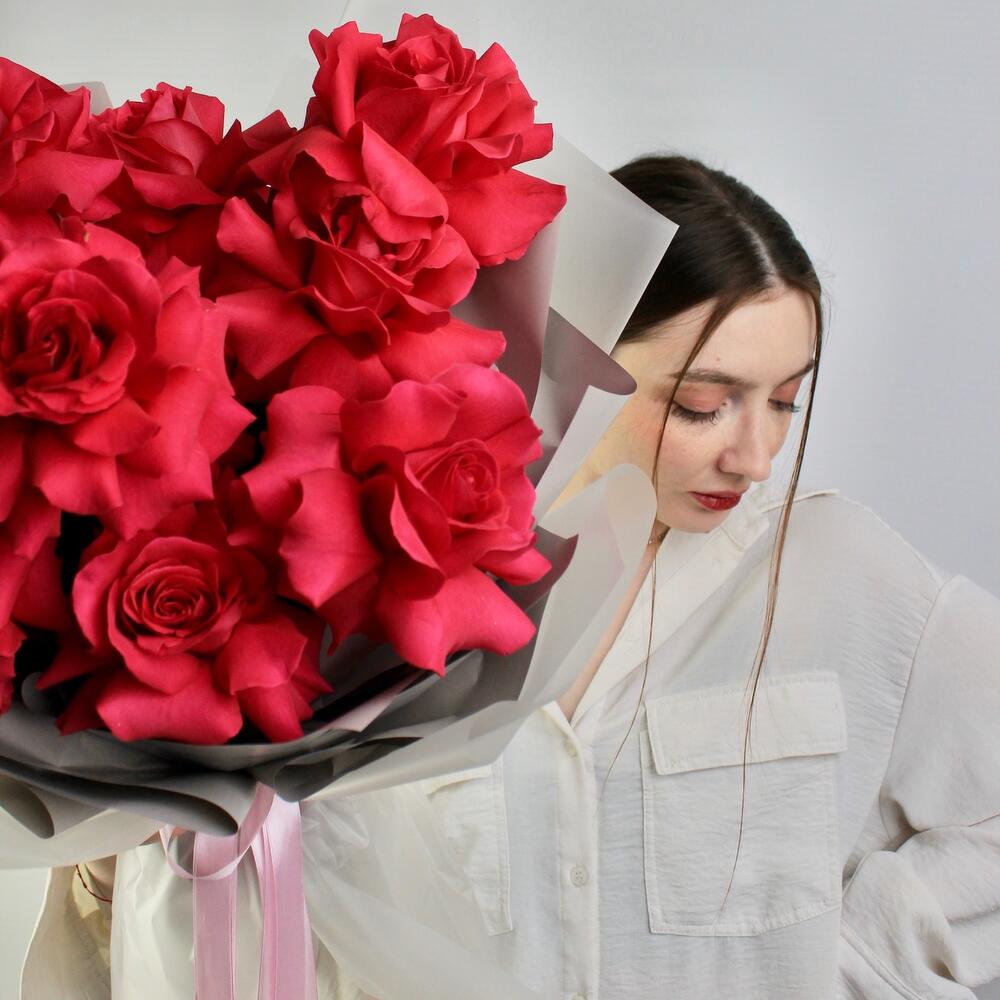 Монобукет из ярко-розовых вывернутых роз в дизайнерской упаковке