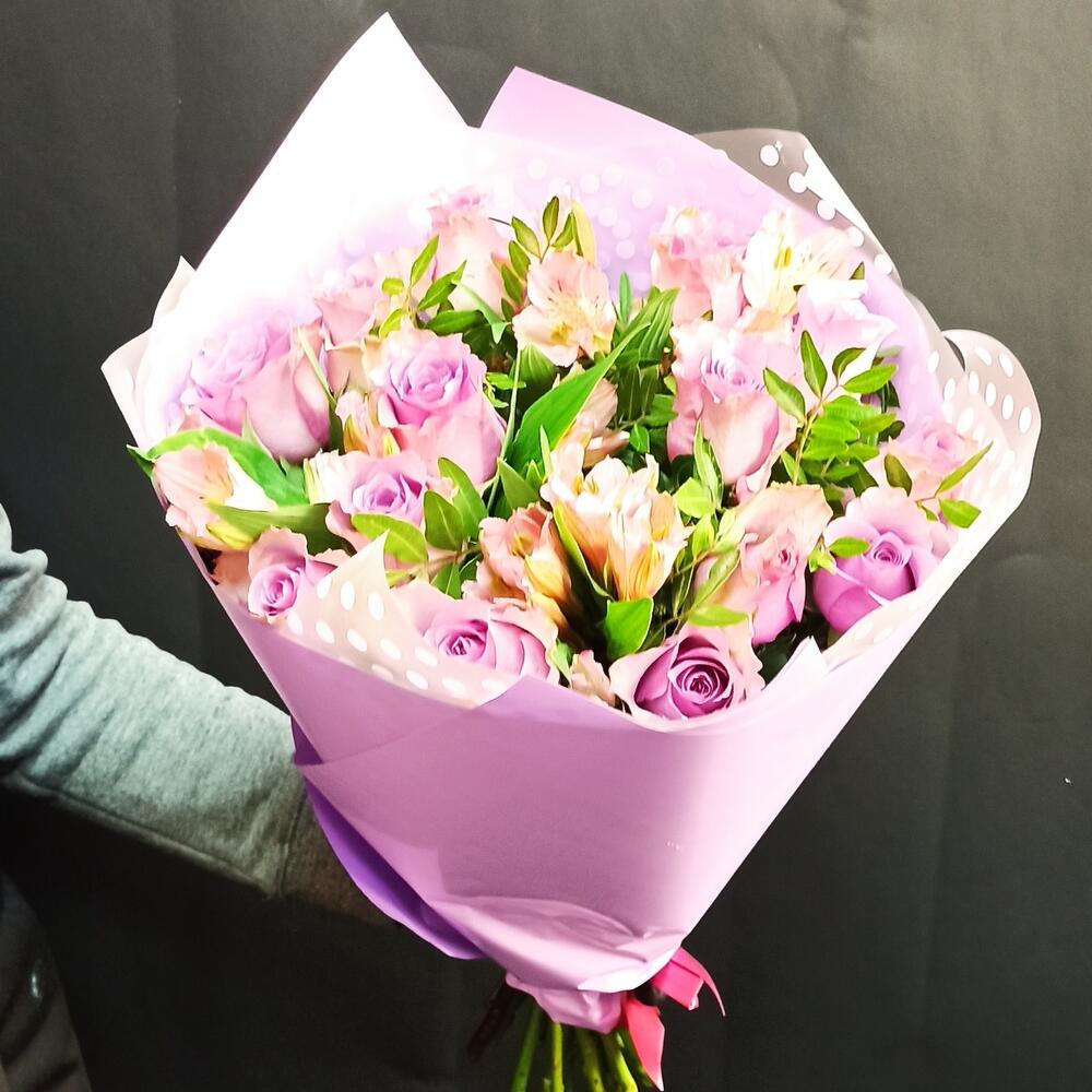 Роза Кенийская – 15 шт.Альстромерия – 3 шт.Фисташка – 5 шт.Упаковка дизайнерская – 2 шт.