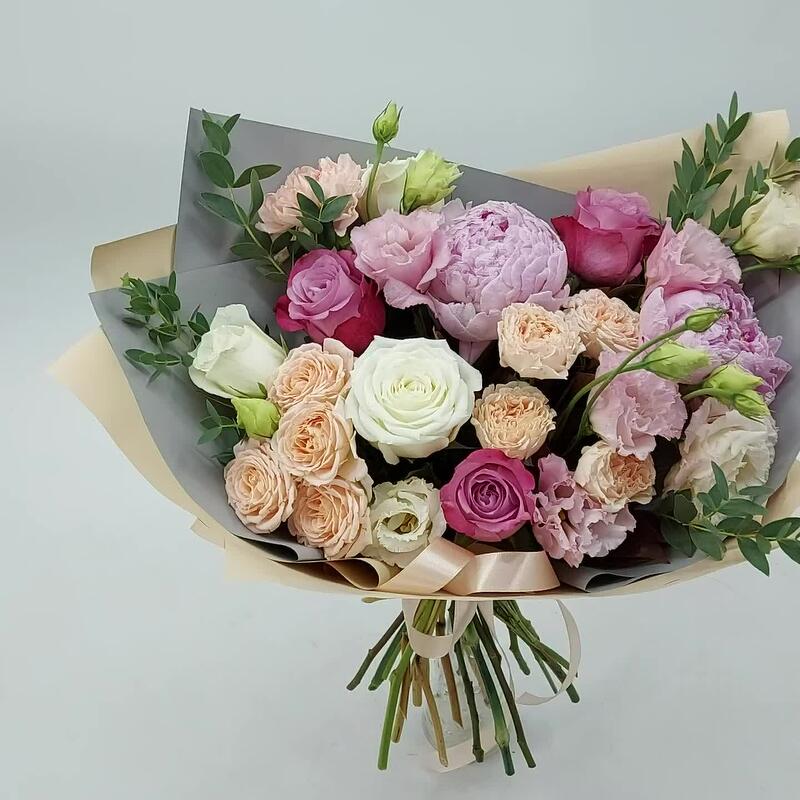 Пион – 2 шт.Роза кустовая – 3 шт.Эвкалипт – 3 шт.Роза Эквадор – 6 шт.Эустома – 3 шт.Упаковка дизайнерская – 1 шт.зелень стаффажная – 6 шт.гвоздика сортовая (диантус) – 1 шт.