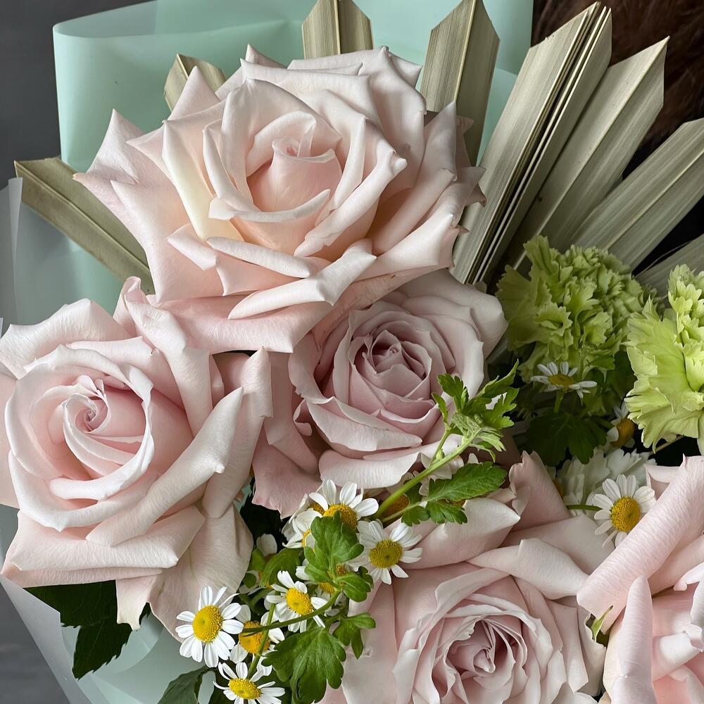 роза sweet escimo премиум – 5 шт.гвоздика lime – 3 шт.Матрикария – 1 шт.пальма веерная сухоцвет – 1 шт.Лагурус – 3 шт.Дизайнерская упаковка – 1 шт.Лента – 1 шт.