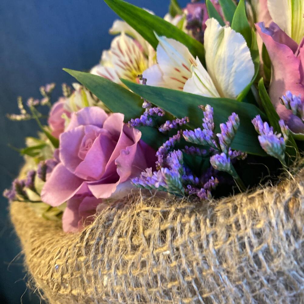 роза кения 40 см – 11 шт.Альстромерия – 4 шт.Эвкалипт Микс – 1 шт.папоротник ветка – 2 шт.Лимониум сиреневый – 1 шт.Мешковина – 1 шт.