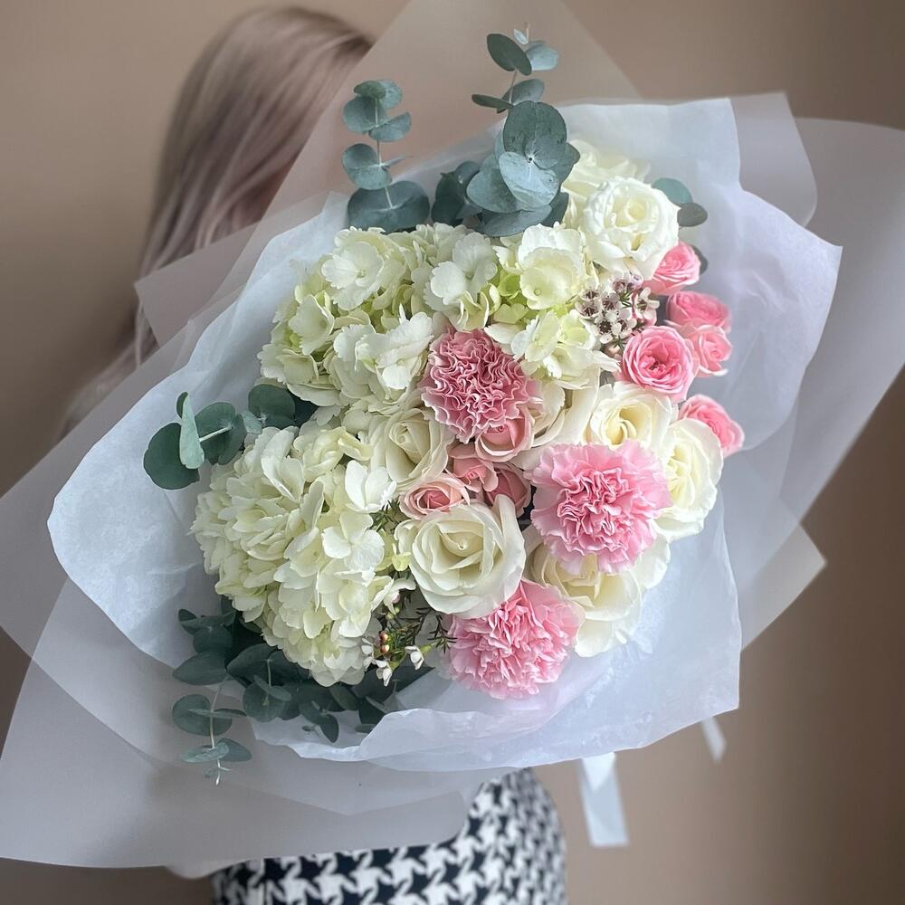 Гвоздики, Пионовидные розы, Розы