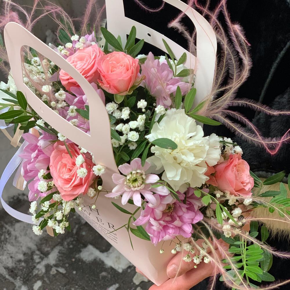 Сумочка – 1 шт.Роза кустовая – 1 шт.Хризантема кустовая – 1 шт.Гвоздика – 3 шт.Гипсофила – 1 шт.зелень декоративная – 1 шт.Сухоцветы – 1 шт.Оазис флористический – 1 шт.Лента атласная – 2 шт.