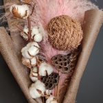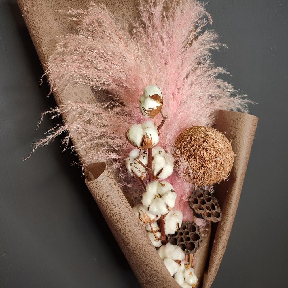 пампасная трава – 2 шт.Хлопок натуральный – 11 шт.Лотос сухой – 2 шт.Шар декоративный – 1 шт.Упаковка дизайнерская – 2 шт.