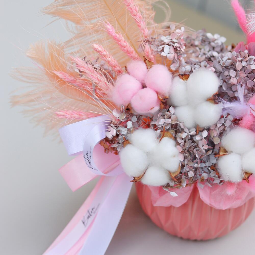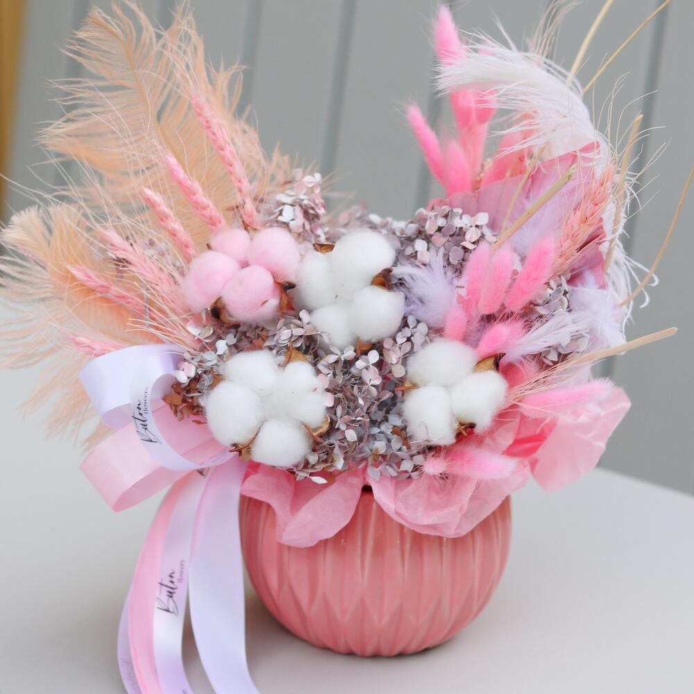 Гортензия – 3 шт.Хлопок – 4 шт.Пальма – 1 шт.Колосья – 8 шт.Лагурус – 16 шт.Кашпо керамическое – 1 шт.Открыточка с вашими пожеланиями – 1 шт.Шоколадка – 1 шт.перо декоративное – 3 шт.ветки декоративные – 2 шт.