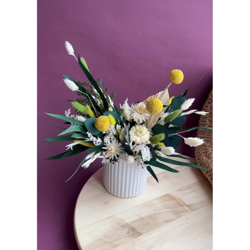 Краспедия желтая – 3 шт.Эвкалипт стабилизированный – 15 шт.Бессмертник – 3 шт.Лагурус – 9 шт.фаларис сухоцвет – 7 шт.озотамнус стабилизированный – 9 шт.