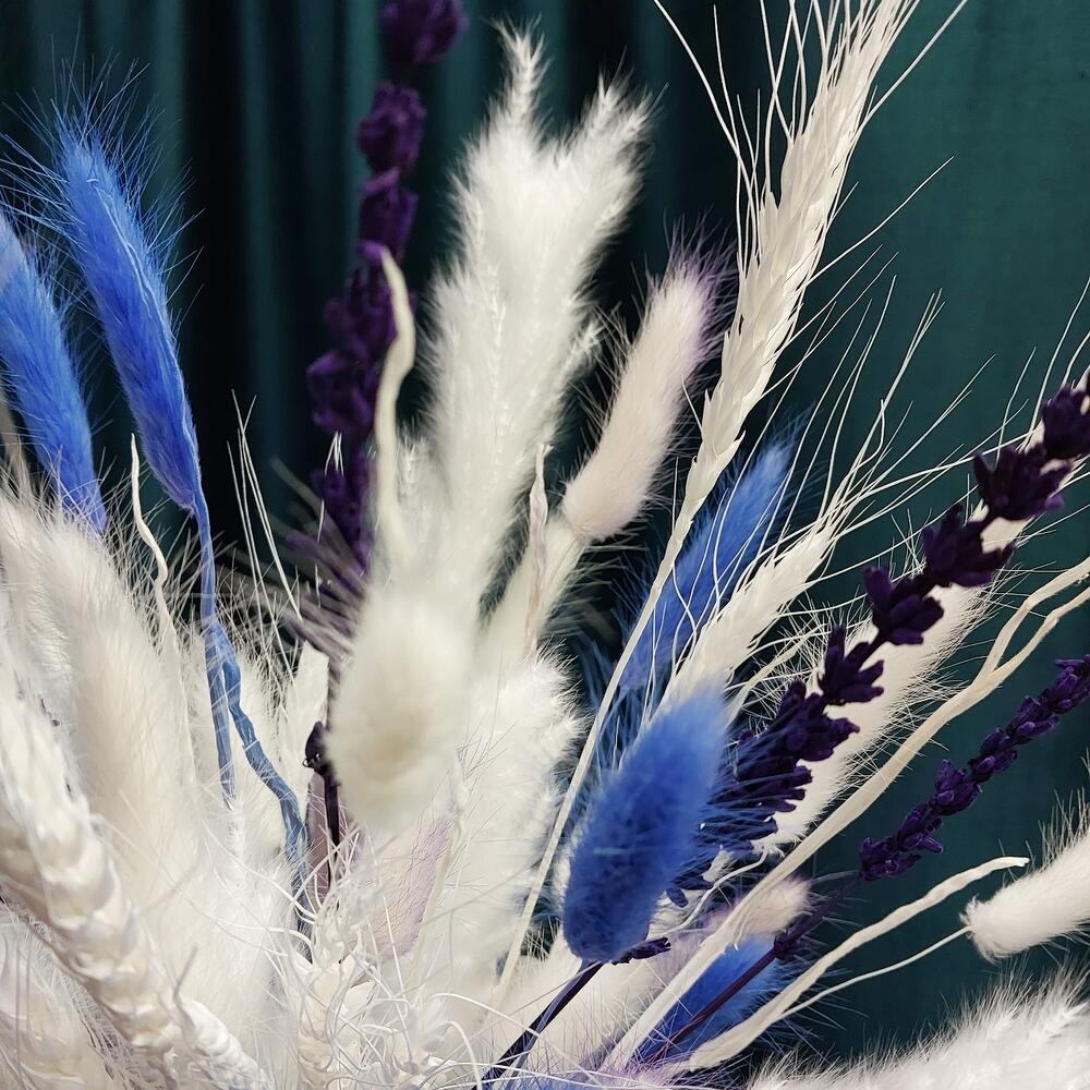 Лагурус (сухоцвет) – 7 шт.Лаванда (сухоцвет) – 2 шт.Помпасная трава – 5 шт.Пшеница (сухоцвет) – 3 шт.Оазис флористический – 1 шт.Коробка шляпная – 1 шт.