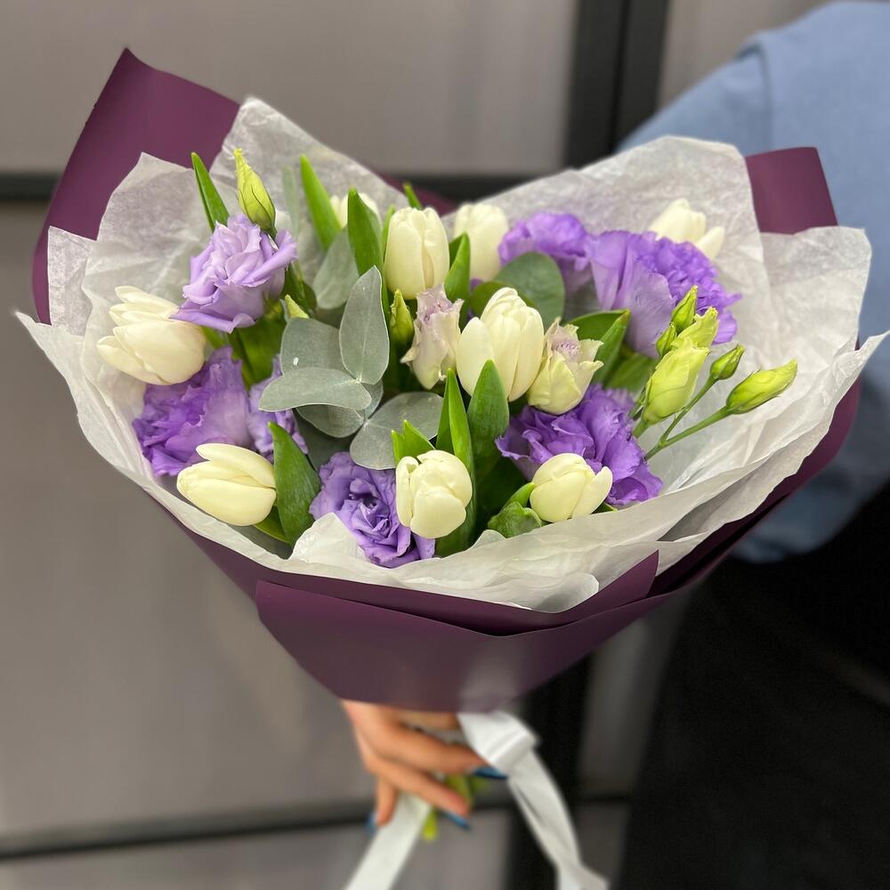 Тюльпан – 9 шт.эустома махровая – 2 шт.Эвкалипт – 1 шт.Тишью – 2 шт.Пленка матовая – 2 шт.Лента атласная – 2 шт.